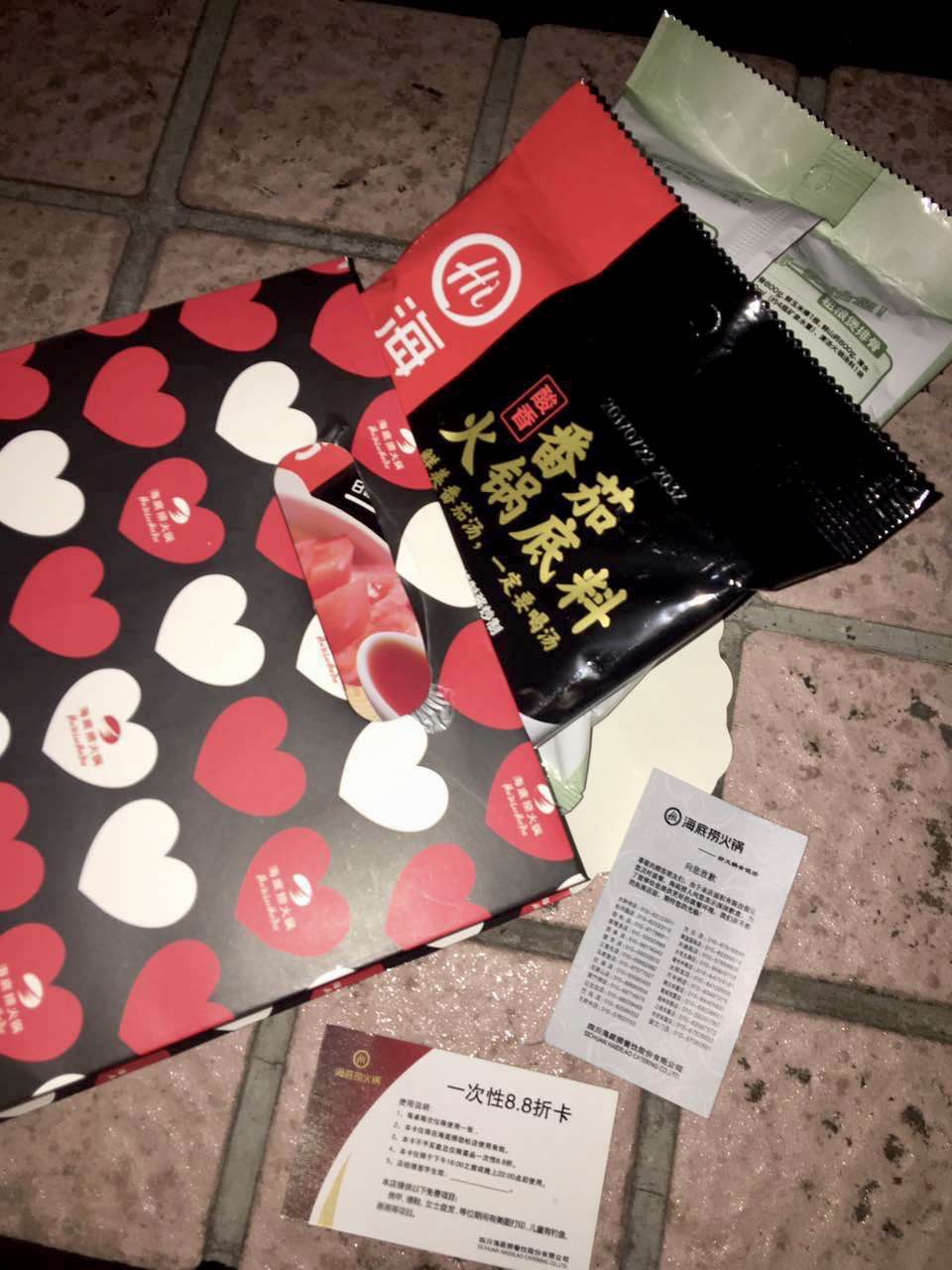 环球网记者观察,门口有几名工作人员向前来吃饭的顾客派发纸袋以致歉意,记者发现纸袋内含2盒海底捞底料,上面写着“鲜美番茄汤,一定要喝汤”,和一张一次性8.8折优惠卡。大约半小时后店员返回店内没有再露面。