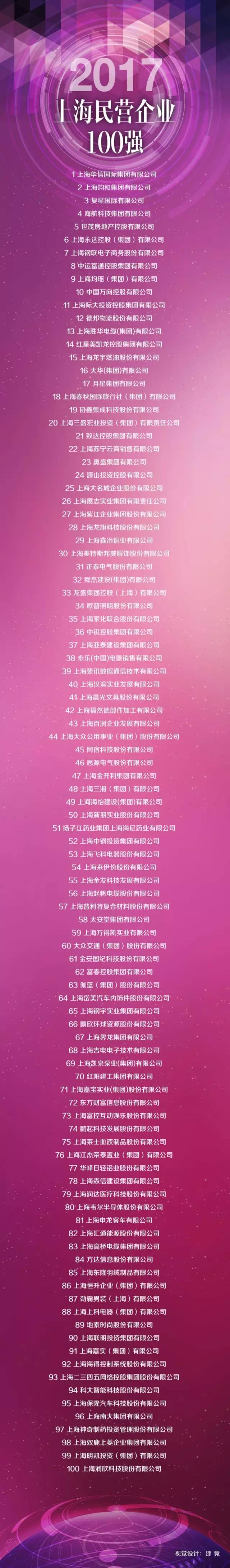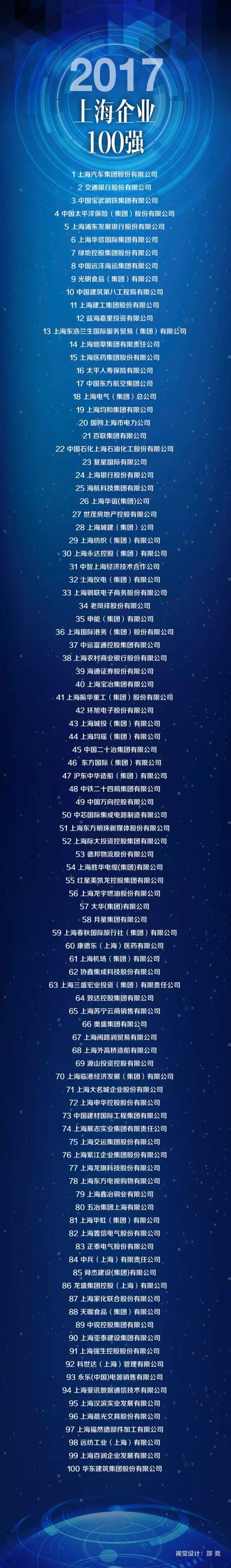 此外,2017上海制造业企业100强、上海服务业企业100强和2017上海民营企业100强、上海民营制造业企业50强、上海民营服务业企业50强排行榜也同期发布。该系列榜单由上海市企业联合会、上海市企业家协会和上海市经济团体联合会共同发布。