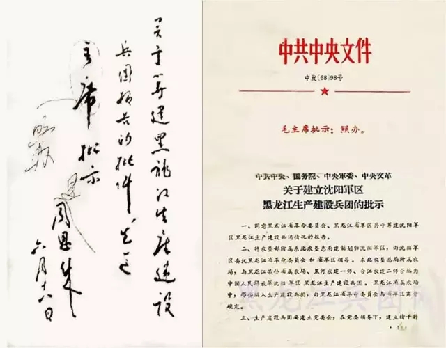 1968年6月18日,中共中央、国务院、中央军委以“中发[68]98号”文件发出了“关于建立黑龙江生产建设兵团的批示”。同意将原东北农垦总局和黑龙江省农垦厅所属的农场以及农建一师、农建二师合编为中国人民解放军沈阳军区生产建设兵团,执行屯垦戍边任务。