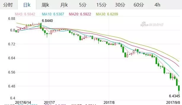 外汇市场实时数据显示,8月25日当天,在岸人民币对美元汇率最高曾达到6.6674元;而在9月8日下午14点15分左右,人民币一度达至6.4345元。