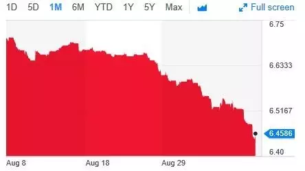 ▲美元对人民币汇率一个月走势(图片来源:雅虎财经)