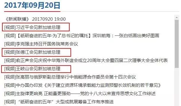 昨晚(9月20日晚)的新闻联播三条都和新加坡总理李显龙有关,前后时长7分钟。当日,国家主席习近平、全国人大常委会委员长张德江、中央纪委书记王岐山先后会见了李显龙。