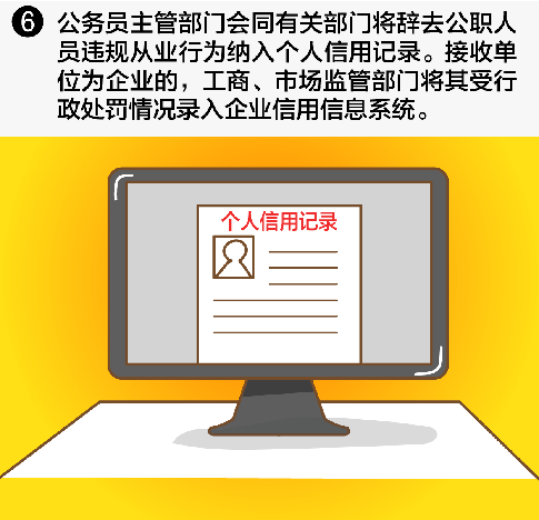公务员主管部门会同有关部门将辞去公职人员违规从业行为纳入个人信用记录。接收单位为企业的,工商、市场监管部门将其受行政处罚情况录入企业信用信息系统。七、建立健全公务员辞去公职后从业备案和监督检查制度。经批准同意辞去公职的公务员,由原单位报公务员主管部门备案。公务员主管部门通过专项检查、接受信访举报、了解舆情报道等方式,对各单位落实公务员辞去公职后从业规定情况进行指导和监督检查。对未按照规定审批,或未履行提醒告知、备案、了解核实等职责,导致辞去公职人员违规从业的,对单位给予通报批评,对相关负责人进行提醒、函询和诫勉,视情节轻重给予组织处理或纪律处分。