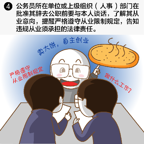 五、公务员所在单位或上级组织(人事)部门在批准其辞去公职前要与本人谈话,了解其从业意向,提醒严格遵守从业限制规定,告知违规从业须承担的法律责任。对不符合从业限制规定的,要劝其调整从业意向;经劝说仍不调整的,不予批准其辞去公职申请。对经批准同意辞去公职的,在从业限制期限内,原单位每年至少与其联系一次,了解和核查从业情况,发现有违反规定的情形,应当及时向公务员主管部门报告。