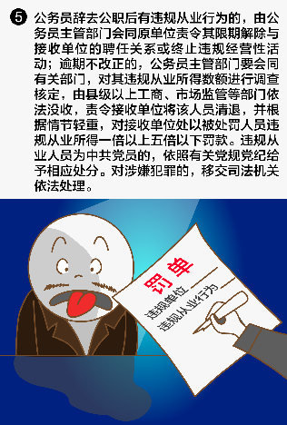 六、公务员辞去公职后有违规从业行为的,由公务员主管部门会同原单位责令其限期解除与接收单位的聘任关系或终止违规经营性活动;逾期不改正的,公务员主管部门要会同有关部门,对其违规从业所得数额进行调查核定,由县级以上工商、市场监管等部门依法没收,责令接收单位将该人员清退,并根据情节轻重,对接收单位处以被处罚人员违规从业所得一倍以上五倍以下罚款。违规从业人员为中共党员的,依照有关党规党纪给予相应处分。对涉嫌犯罪的,移交司法机关依法处理。