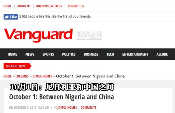 8日,尼日利亚Vanguard发表了名为《10月1日:尼日利亚和中国之间》的报道,称虽然中国和尼日利亚都是在二战之后建立新政权,但是中国的发展速度令人震惊,就好像新中国比尼日利亚早建国一个世纪一样。
