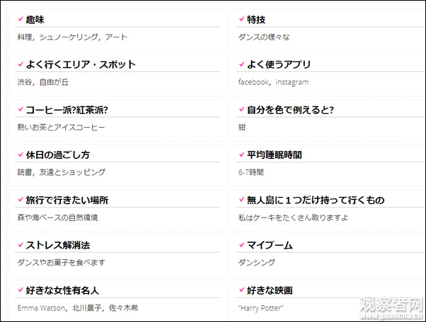她擅长舞蹈,兴趣爱好是料理、浮潜和艺术,喜欢的电影是哈利波特,爱喝红茶和冰咖啡。