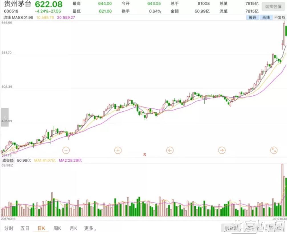 ▲截至10月30日,贵州茅台股价已达622元