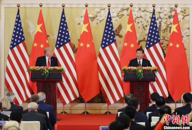 11月9日,国家主席习近平与美国总统特朗普在北京人民大会堂共同会见记者