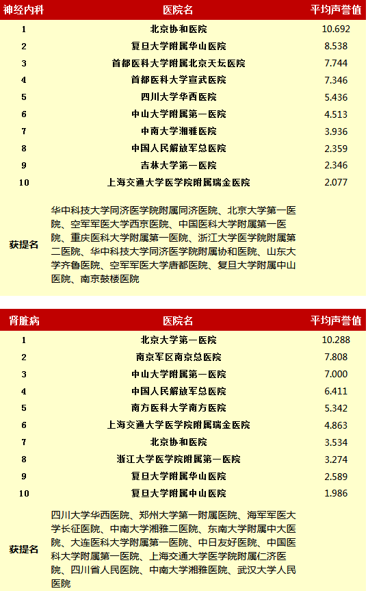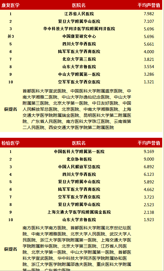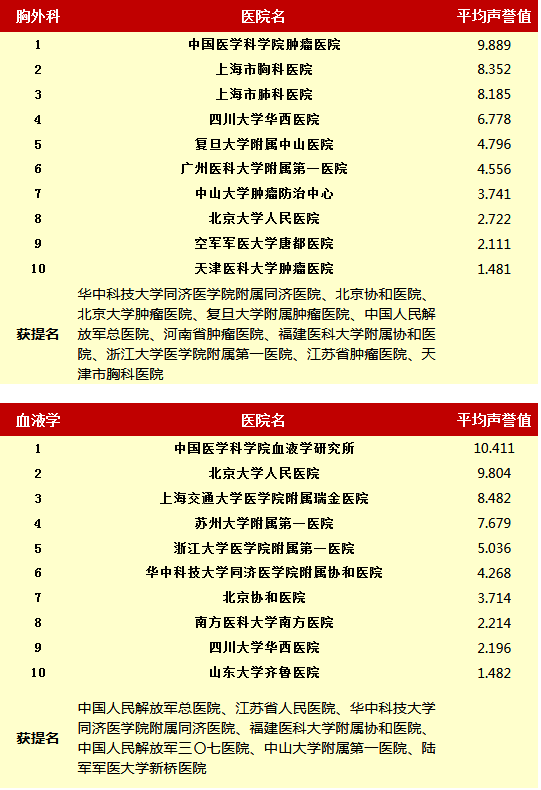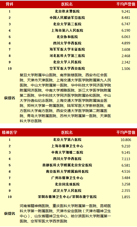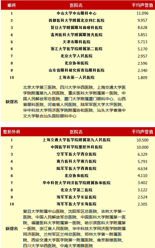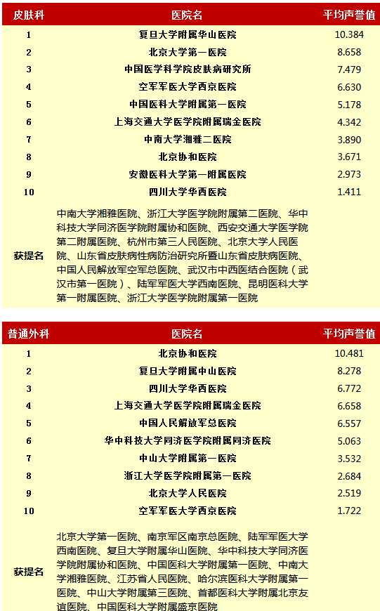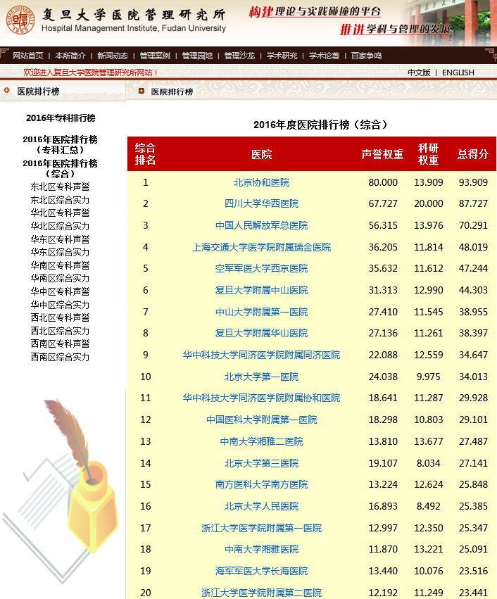 复旦大学医院管理研究所从2010年开始,每年推出上一年度的《中国医院专科声誉排行榜》和《中国医院排行榜》,其评审专家来自中华医学会和医师学会,涉及37个临床专科,向4173位专家发挂号信,收到有效回执2657份(每年有所变动)。