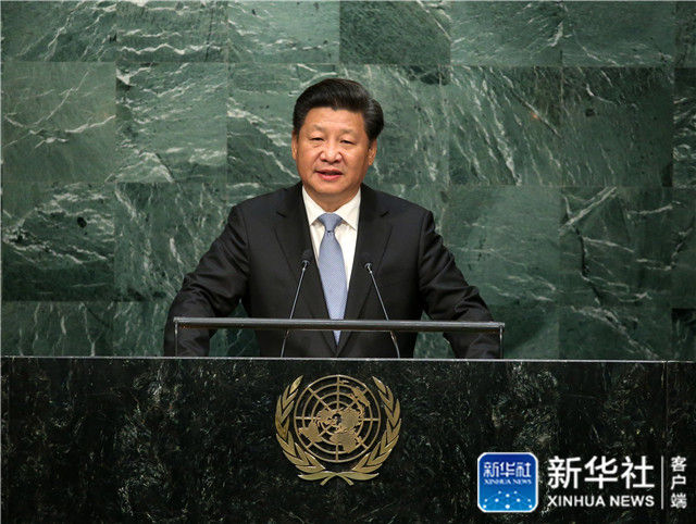 ↑2015年9月28日,习近平在纽约联合国总部出席第70届联合国大会一般性辩论并发表题为《携手构建合作共赢新伙伴同心打造人类命运共同体》的重要讲话。新华社记者庞兴雷摄