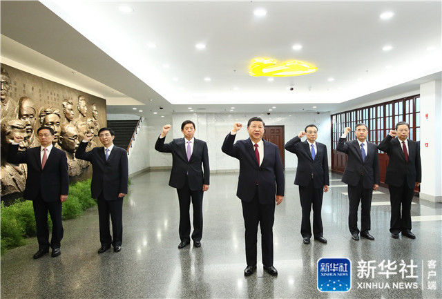 ↑2017年10月31日上午,习近平带领其他中共中央政治局常委同志在上海中共一大会址纪念馆一起重温入党誓词。新华社记者兰红光摄