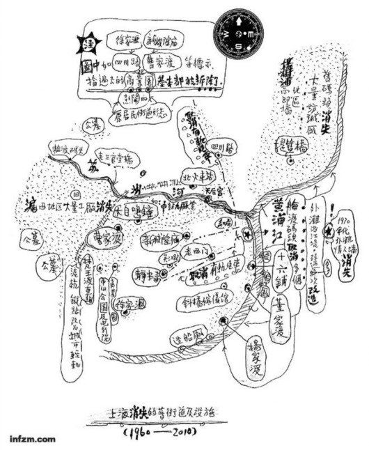 去年,王家卫要改编拍摄金宇澄的作品《繁花》,一本用上海话写就的、关于上海自己的故事。王家卫让金宇澄画一幅图,标出过去半个世纪,上海的哪些旧街道和建筑消失了。金宇澄密密麻麻画了一张纸,里面涉及较著名的地标有提篮桥、老西门、曹家渡、十六铺等。
