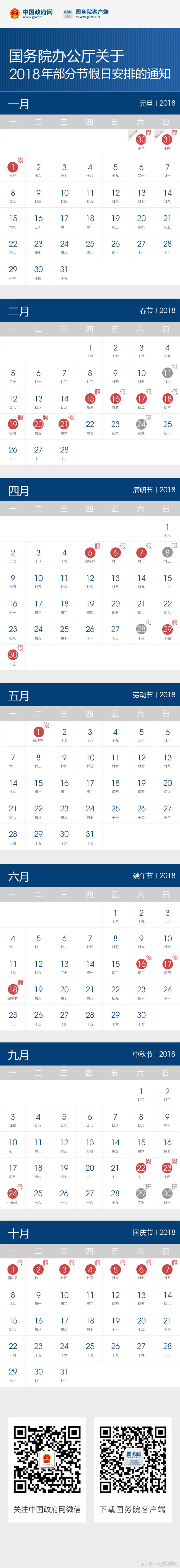 经国务院批准,现将2018年元旦、春节、清明节、劳动节、端午节、中秋节和国庆节放假调休日期的具体安排通知如下。