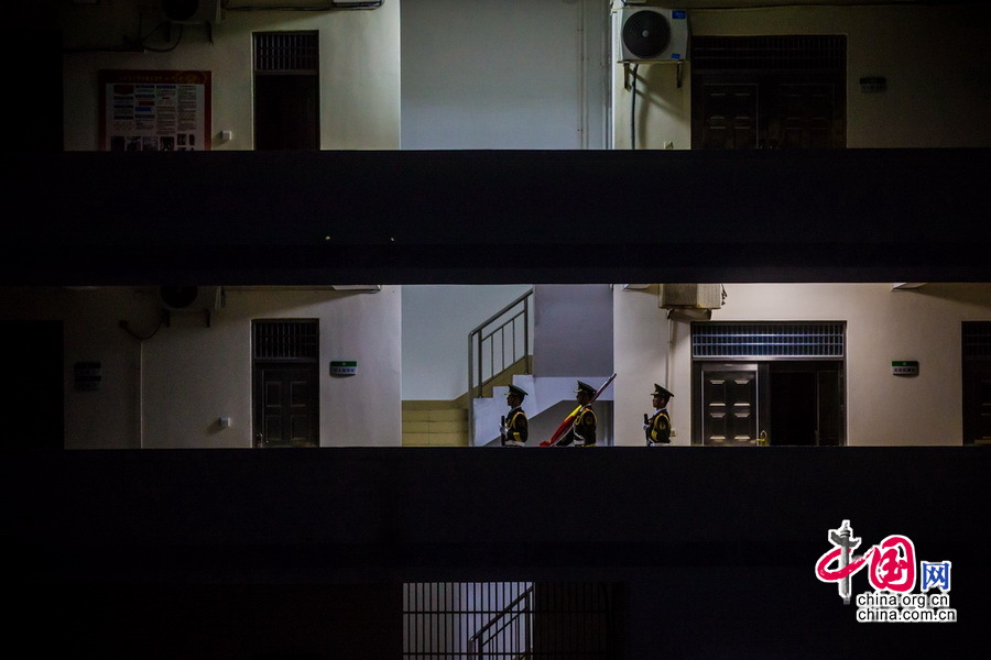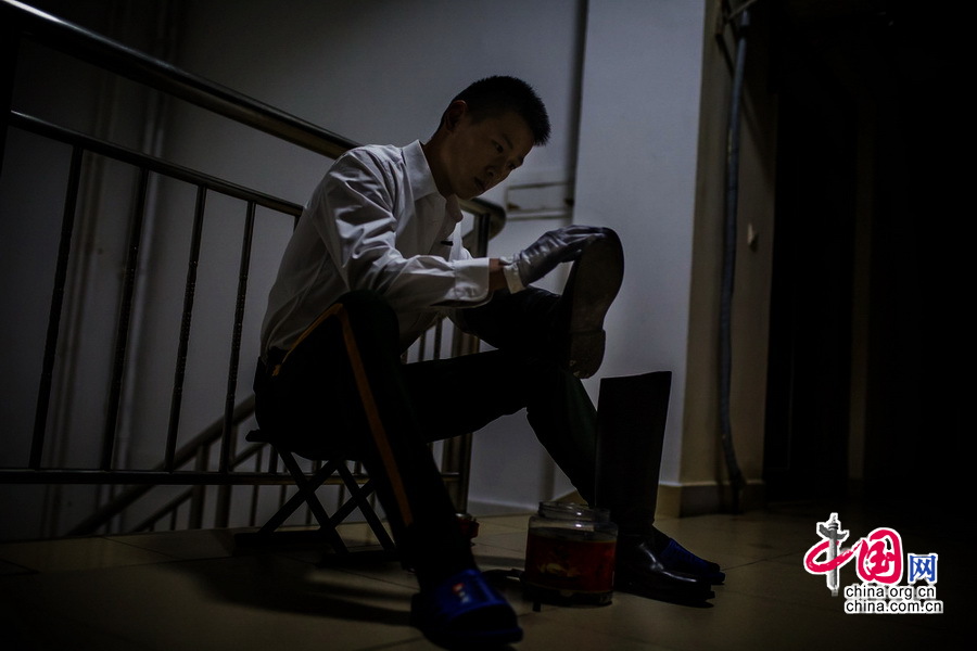 每到升旗仪式当天,赵凯龙都会比平时早起1个小时开始准备,为了不影响战友休息,他会在宿舍的走廊上把自己的皮靴擦得一尘不染,用他的话说就是,只有身着一尘不染的军装,才能配上飘扬的五星红旗。中国网记者郑亮摄