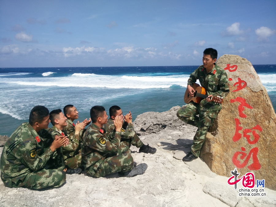 作为军事训练排头兵的班长赵凯龙还是个能文能武的全才,平时在没有任务的时候,战士们最喜欢拉着班长到海边听他弹吉他,那些熟悉的歌曲在海浪声中格外动听。驻守在岛上的生活虽然是艰苦的,但是赵凯龙和他的战友心里都知道,要为维护祖国领土完整做出奉献,这项工作责任重大,使命光荣。武警海南省总队驻三沙市中队供图