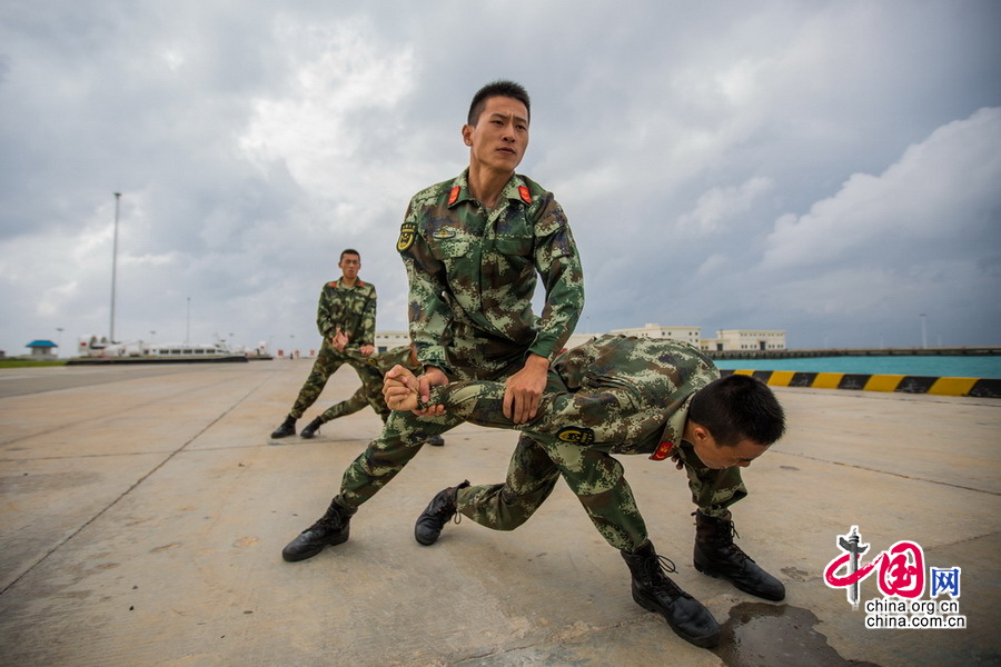 岛上固定的升旗时间是每周一早上6点50分,但是赵凯龙和他的战友通常会提前很久便起床整理着装,并在驻地楼下的小空场做最后的演练,保证升旗万无一失。中国网记者郑亮摄