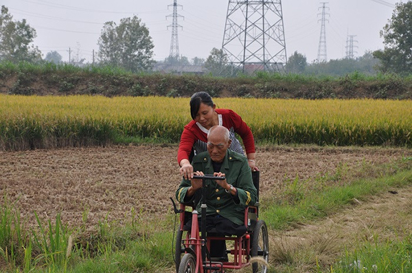 邵桃荣推着黄礼和走在乡间小路,感受自然。 武汉市文明办供图