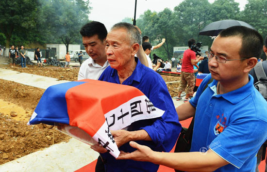 在长沙春华镇的抗日阵亡将士墓园守墓50年的刘金国将浙江籍抗日英烈遗骸送至安葬处。龙巍/东方IC