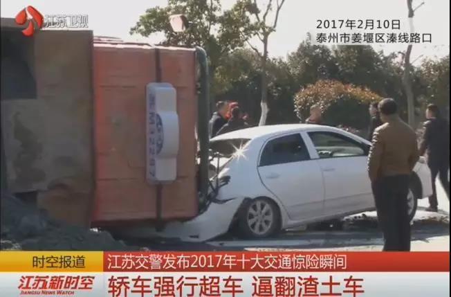 2017年2月10日,江苏泰州市姜堰区溱线路口,强行超车的轿车将正常行驶的渣土车逼翻在地,幸好渣土车只砸中了轿车的后备箱,并未造成伤亡。交警提醒,变道超车时,一定不能影响其他车辆的正常行驶,切记先观察、再打灯变道。