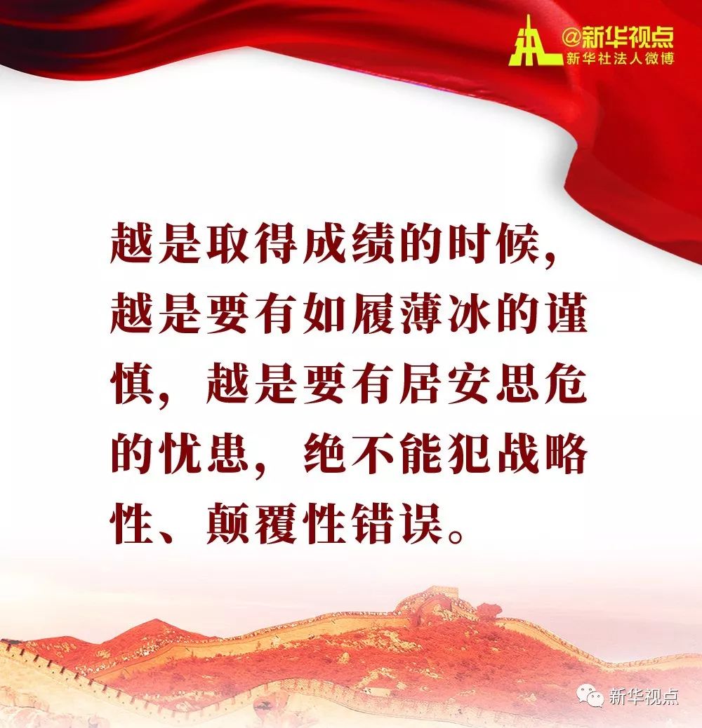 习近平强调,“备豫不虞,为国常道”。当前,我国正处于一个大有可为的历史机遇期,发展形势总的是好的,但前进道路不可能一帆风顺,越是取得成绩的时候,越是要有如履薄冰的谨慎,越是要有居安思危的忧患,绝不能犯战略性、颠覆性错误。面对波谲云诡的国际形势、复杂敏感的周边环境、艰巨繁重的改革发展稳定任务,我们既要有防范风险的先手,也要有应对和化解风险挑战的高招;既要打好防范和抵御风险的有准备之战,也要打好化险为夷、转危为机的战略主动战。我们要继续进行具有许多新的历史特点的伟大斗争,准备战胜一切艰难险阻,朝着我们党确立的伟大目标奋勇前进。