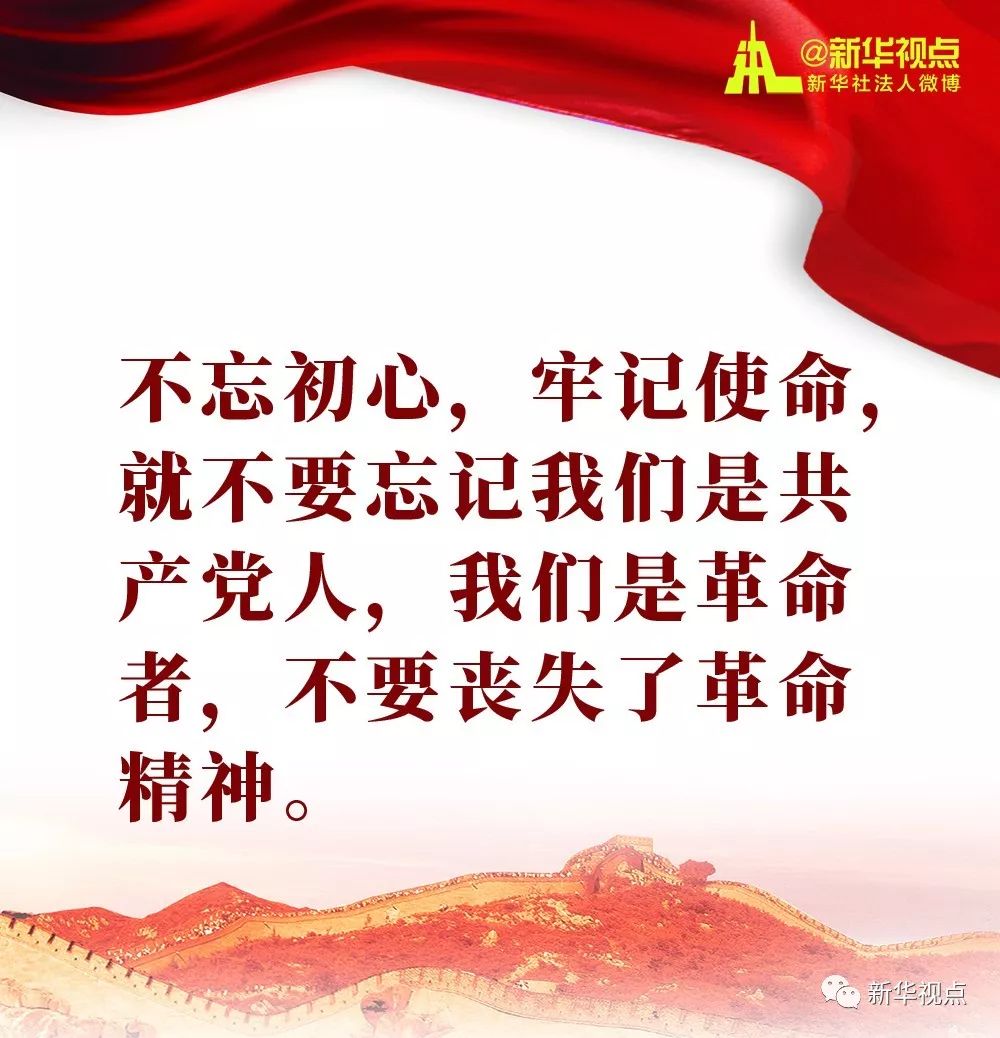 习近平强调,不忘初心,牢记使命,就不要忘记我们是共产党人,我们是革命者,不要丧失了革命精神。昨天的成功并不代表着今后能够永远成功,过去的辉煌并不意味着未来可以永远辉煌。时代是出卷人,我们是答卷人,人民是阅卷人。要实现党和国家兴旺发达、长治久安,全党同志必须保持革命精神、革命斗志,勇于把我们党领导人民进行了97年的伟大社会革命继续推进下去,决不能因为胜利而骄傲,决不能因为成就而懈怠,决不能因为困难而退缩,努力使中国特色社会主义展现更加强大、更有说服力的真理力量。