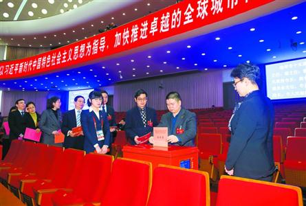 选举开始前,监票人和选举工作人员检查了设在会场内的投票箱。接着,工作人员向每位代表分发了四张选票,分别为市人大常委会主任、副主任、秘书长选票,市长、副市长选票,市监察委员会主任选票,市高级人民法院院长、市人民检察院检察长选票。选票上都盖有大会秘书处的印章。大会还设立了秘密写票处。