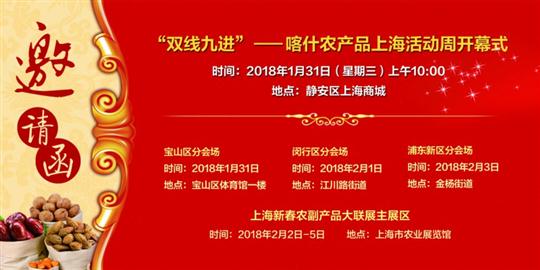 为帮助喀什特色农产品卖得出去,卖出好价钱,上海市对口支援新疆工作前方指挥部将以“上海新春农产品大联展”为契机,在市合作交流办、市商务委、市农委以及对口四区的支持协同下,于2018年1月27日-2月5日开展“双线九进”——喀什农产品上海活动周展示展销和宣传活动,旨在向上海等内地市场拓展和提升喀什地区特色农产品的品牌知名度,帮助上海对口援疆四县的特色农产品打开销路、提高销量,精准帮扶建档立卡贫困户,为喀什地区早日打赢脱贫攻坚战提供强大支撑。