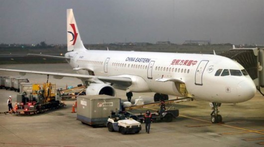 1月20日东方航空班机飞抵桃园机场。(图:中时电子报)