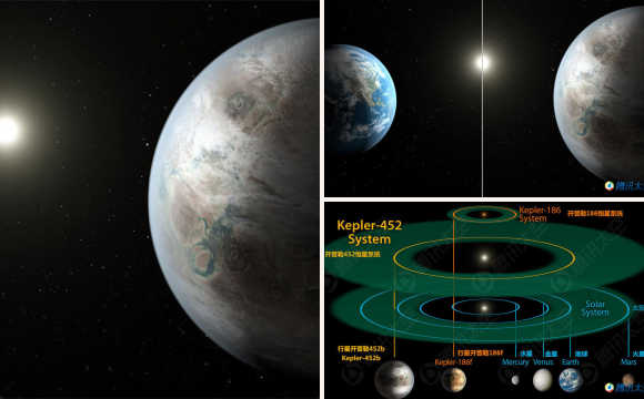 “开普勒-452b”位于地球1400光年的“天鹅座”方向,体积只比地球大60%。公转周期为385个地球日,比地球绕太阳一周的时间多出5%。其所围绕的中央恒星无论大小、亮度都与我们太阳非常相似,年龄大约在60亿岁,比太阳大15亿岁。