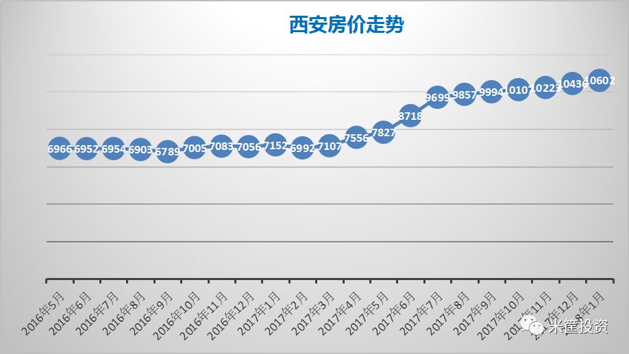 在整个中国房价暴涨的2016年,西安没什么动静,那时的资金还在北上广深闹腾,没人关注西北这个门户城市。但到2017年,随着房价暴涨轮动到二线城市,西安也开始异动,尤其是在2017年7月、8月,房价从7800直接飙到9600。