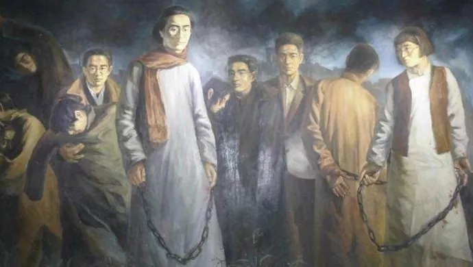 2月7日夜里,敌人借口转狱,一一点名,从牢房里提出了24个人(一说23人———笔者注)。其中有3名女囚。他们排成两行,刚过院中的小桥,还没走到刑场,突然枪声就响起了,枪声密集,不知是机枪还是步枪,枪声夹杂着口号声,一阵又一阵,很久很久才归于静寂。以后人们清点遗体,发现每一个烈士的身上都中了七、八颗子弹……他们中有李求实、柔石、胡也频、殷夫、冯铿五位左翼作家。