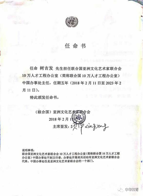 蔡维扬主任向所辖的团体会员,相关团队和部分艺术家颁发了证书。亚文联主席项洋宣读了部分部门的人事任命并颁发任命书,向中华知青总汇树吉发颁发了任命书,任命其为联合国10万人才工程办公室主任.这个任命宣示了中国知青将通过联合国的平台走向世界,填补了联合国在知青历史上的空白,让世界可以深入了解中国知青这个前无古人,后无来者的特殊群体.