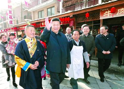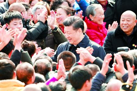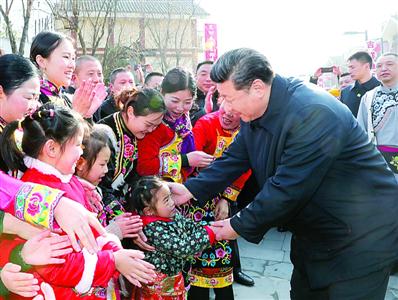 春节在即,村里照全家福、写春联福字、包汤圆等新春民俗活动丰富多彩。习近平每到一处,都驻足同群众交流,他说:“我是人民的勤务员,让人民过上好日子是我们共产党人的初心、宗旨。”临行前,村民们欢呼着簇拥上来向总书记拜年,习近平热情同村民们打招呼,祝乡亲们安逸舒适、新春快乐、阖家幸福。