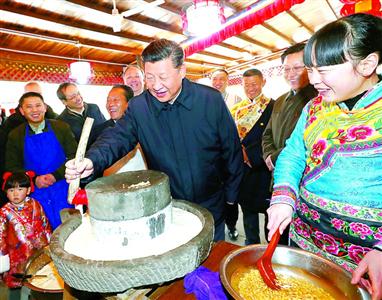 2月12日上午,习近平在阿坝藏族羌族自治州汶川县映秀镇考察时同居民群众一起磨豆花。