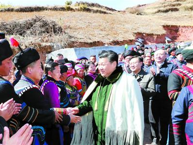 三河村平均海拔2500多米,是一个彝族贫困村。习近平沿着石板小路步行进村,察看村容村貌和周边自然环境。他先后走进村民吉好也求、节列俄阿木2户贫困家庭看望,详细观看门前的扶贫联系卡,同主人亲切拉家常,询问生活过得怎么样,发展什么产业,收入有多少,孩子有没有学上。他饶有兴趣地听10岁小女孩吉好有果唱《国旗国旗真美丽》,并带头鼓掌。在村民节列俄阿木家,习近平同村民代表、驻村扶贫工作队员围坐在火塘边,一起分析当地贫困发生的原因,谋划精准脱贫之策。大家用朴实生动的语言表达了见到总书记的喜悦和幸福,畅叙了党和政府对彝族同胞的关怀关爱,述说了脱贫攻坚行动给乡亲们带来的大量实惠,人人都边说边激动得流泪。习近平饱含深情地说,我一直牵挂着彝族群众,很高兴来到这里,看到大家日子一天天好起来,心里十分欣慰。得知近年来村里大力发展种养业,引进优良品种的牛猪羊,家家户户种植了马铃薯、核桃、花椒,农民收入持续增加,习近平十分高兴。他强调,发展特色产业、长期稳定致富,都需要人才。要培养本地人才,引导广大村民学文化、学技能,提高本领,还要移风易俗,通过辛勤劳动脱贫致富。习近平指出,我们搞社会主义,就是要让各族人民都过上幸福美好的生活。全面建成小康社会最艰巨最繁重的任务在贫困地区,特别是在深度贫困地区,无论这块硬骨头有多硬都必须啃下,无论这场攻坚战有多难打都必须打赢,全面小康路上不能忘记每一个民族、每一个家庭。