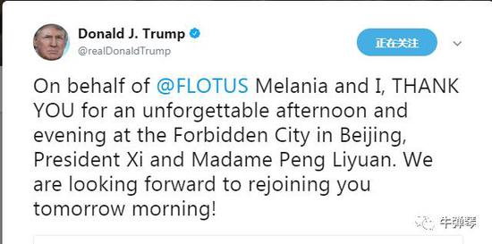 我谨代表自己和夫人梅拉尼娅,感谢中国最高领导人夫妇在北京紫禁城带来了一个难忘的下午和晚上。我们期待明天早上和两人再次相见。