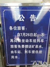 昨天,有网友发布微博称,在车站看到公告栏中写道,即日起不再向乘坐动车组列车旅客免费赠送矿泉水,由车站、列车提供饮用水。还有网友表示,每次坐高铁,都在车站领矿泉水,昨天被告知接通知不再发了,有些郁闷。