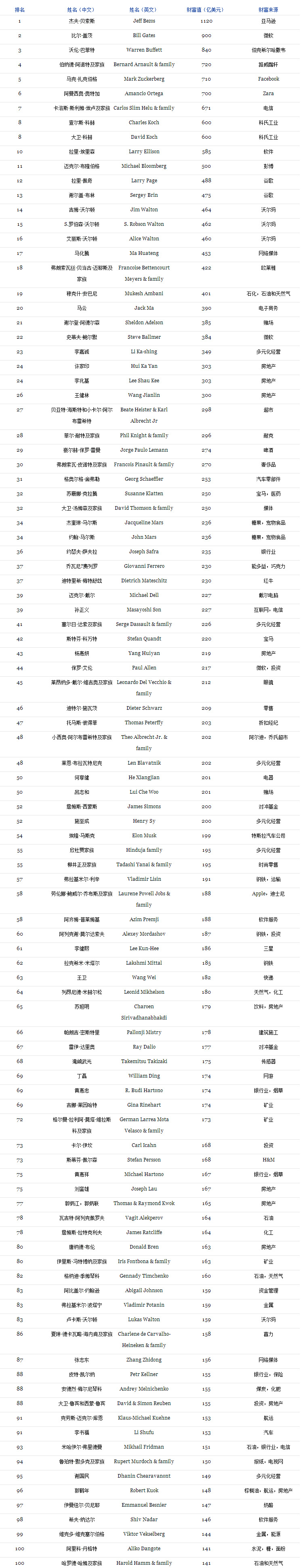 Facebook(182.01, 1.61, 0.89%)的马克·扎克伯格排名第五,身家为710亿美元。西班牙服装零售商阿曼西奥·奥特加排名第六,自2011年以来首次掉出前五,他名下的服装连锁品牌Zara广为人知。