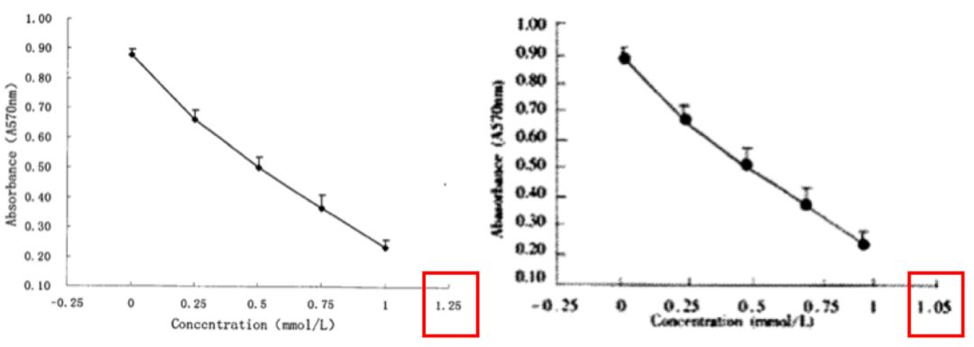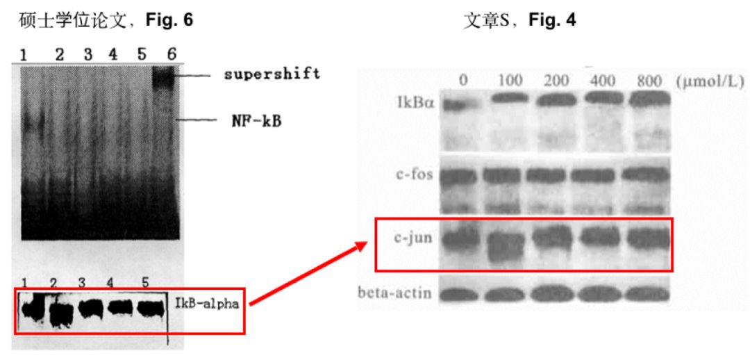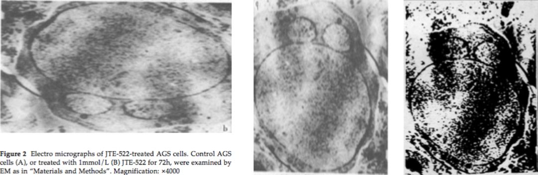 ►ROS文的Figure 2的图B(最左侧)称处理条件为1mmol/L的JTE-522处理72h;最左侧的图经过180顺时针旋转并改变大小后就得到中图,与最右侧硕士学位论文的Fig. 2B高度相似,但该图称其处理条件为0.5mmol/L的JTE-522处理72h。