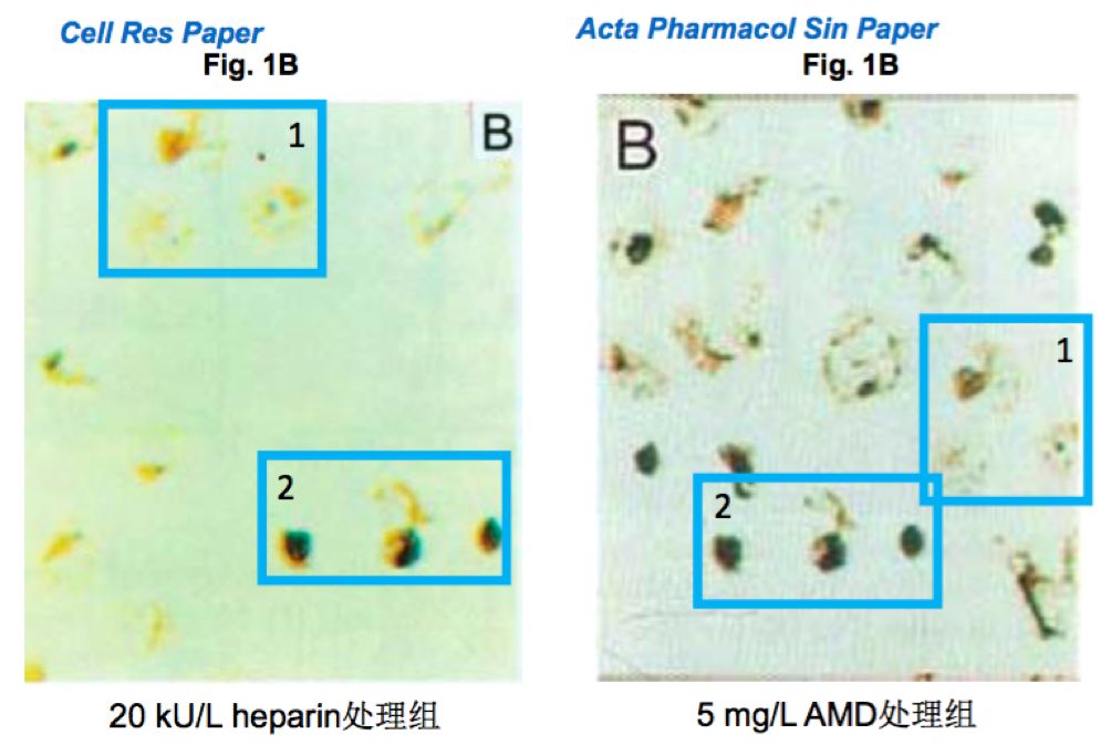 ►左图来自Cell Res文的Fig.1B,20 kU/L肝素处理组;右图来自Acta文的Fig.1B,5mg/L阿霉素处理组