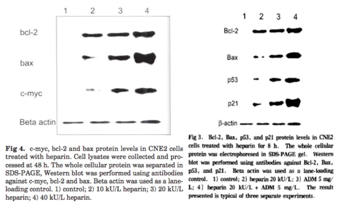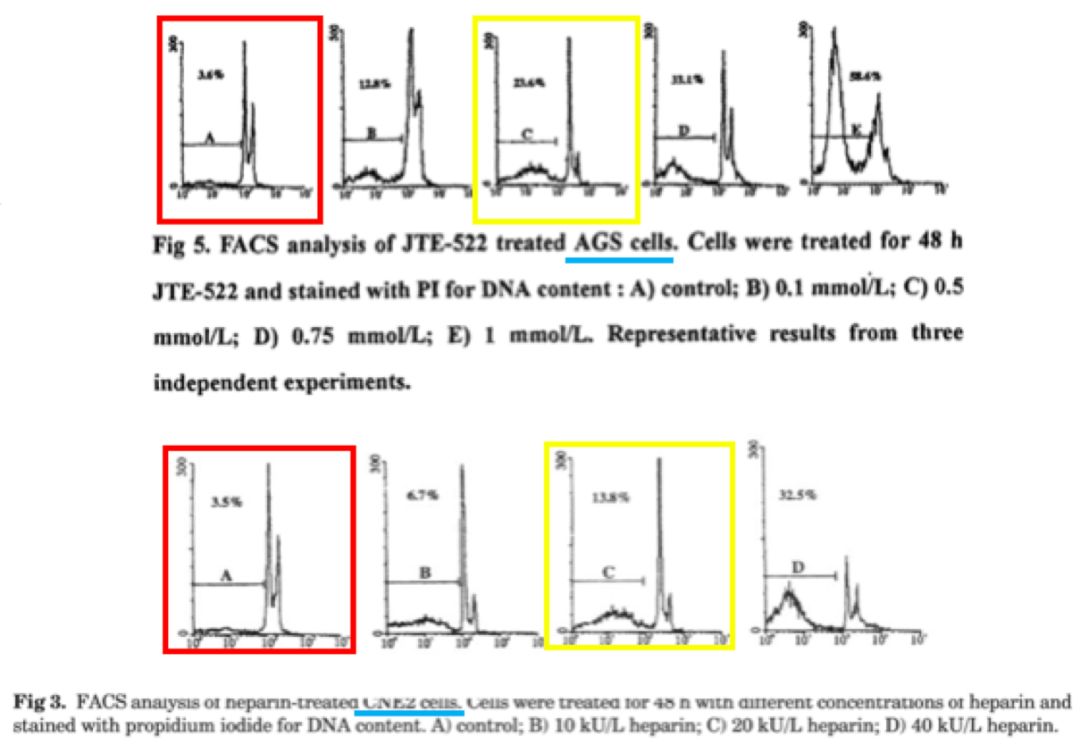 ►左图来自Cell Res文的Fig.1A,TUNEL法显示在用肝素处理后,CNE2细胞的形态出现了显著变化A)对照组;右图来自Acta文的Fig.1A,TUNEL法显示在用肝素处理后,CNE2细胞的形态出现了显著变化(加或不加阿霉素) A)对照组。