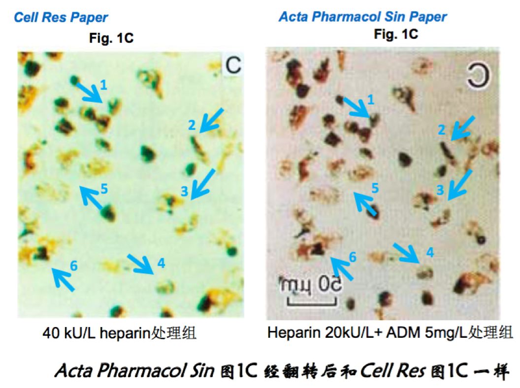 ►左图来自Cell Res的Fig.1C,40 kU/L肝素处理组;右图来自Acta文的Fig.1C,20 kU/L肝素+5mg/L阿霉素处理组。Acta文图1C经翻转后和Cell Res图1C一样(除背景不同外)。