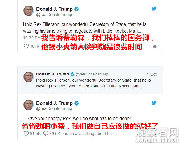 而且特朗普与国务院之间也明显缺乏协调性。最极端的例子是,去年10月1日,特朗普曾经在推特上公开否定蒂勒森的对朝工作。