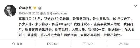 李敖辉煌一生,风流一生,禁书近百本。这位才子的身边美女如云才女无数,其一生有过两段婚姻。在这里,不得不提的是,他的第一任妻子,曾被誉为“70年代台湾第一美女”的胡因梦也成为他心中永远的红玫瑰。李敖晚年曾在微博上怀念道:“离婚以后23年,我送她50朵玫瑰。是蓦然回首,是生日礼物。”更是无限惆怅到“多少人非,多少物故”。