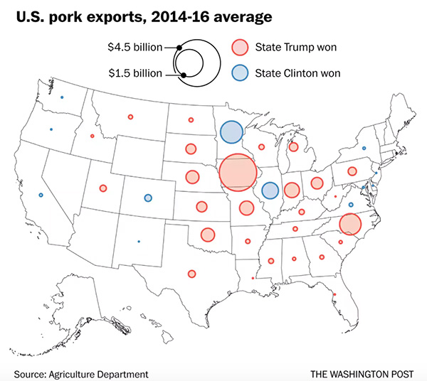 基于2014-2016年均水平,美国猪肉出口州的分布情况。红色为特朗普赢下的州,蓝色为希拉里赢下的州。