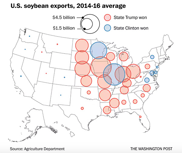 然而,事与愿违。在2016年美国大选时多数支持特朗普的农产品大州即将遭殃。如果农场主在中美贸易摩擦中“躺枪”,共和党或失去不少国会席位。
