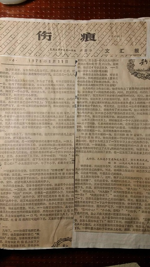 有一天,提着暖瓶拿着饭碗要去食堂,从楼上下来,看见一层正对楼梯的墙上贴出了新的墙报,头条是一年级新生卢新华的小说《伤痕》,那字写得很漂亮。很快,那墙报面前便总是挤满了人,小说的故事情节也成了大家终日的话题。