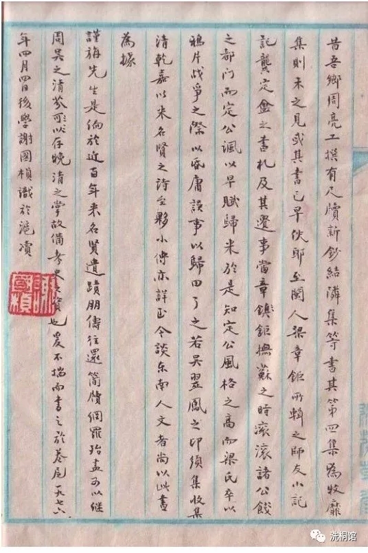 由此,我联想起另外一册家传手钞本《故交遗翰节存》。我的曾伯祖父蒋钦顼先生曾抄录过清代咸同年間五十四位学者、文士及官員致我六世祖衍芬草堂主人蒋光焴先生的信札一百六十一通,命其名为《名人尺牍节录》。版本学家谢国楨先生曾为之题词:“谨旃先生是编,於近百年来名贤遗跡、朋儔往还简牘,网罗殆尽,可以继周、吴之清芬,存晚清之掌故,备考史之资也。”(见下图)
