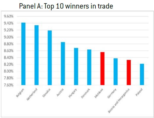 根据Bruegel数据表明,在“一带一路”倡议的前十名受益者中,荷兰是第二,奥地利是第四。“一带一路”带来基础设施的互联互通,会带来运输成本的的降低。一旦运输成本降低,荷兰和奥地利的贸易量将会在现有基础上分别增长9.35%和8.85%。